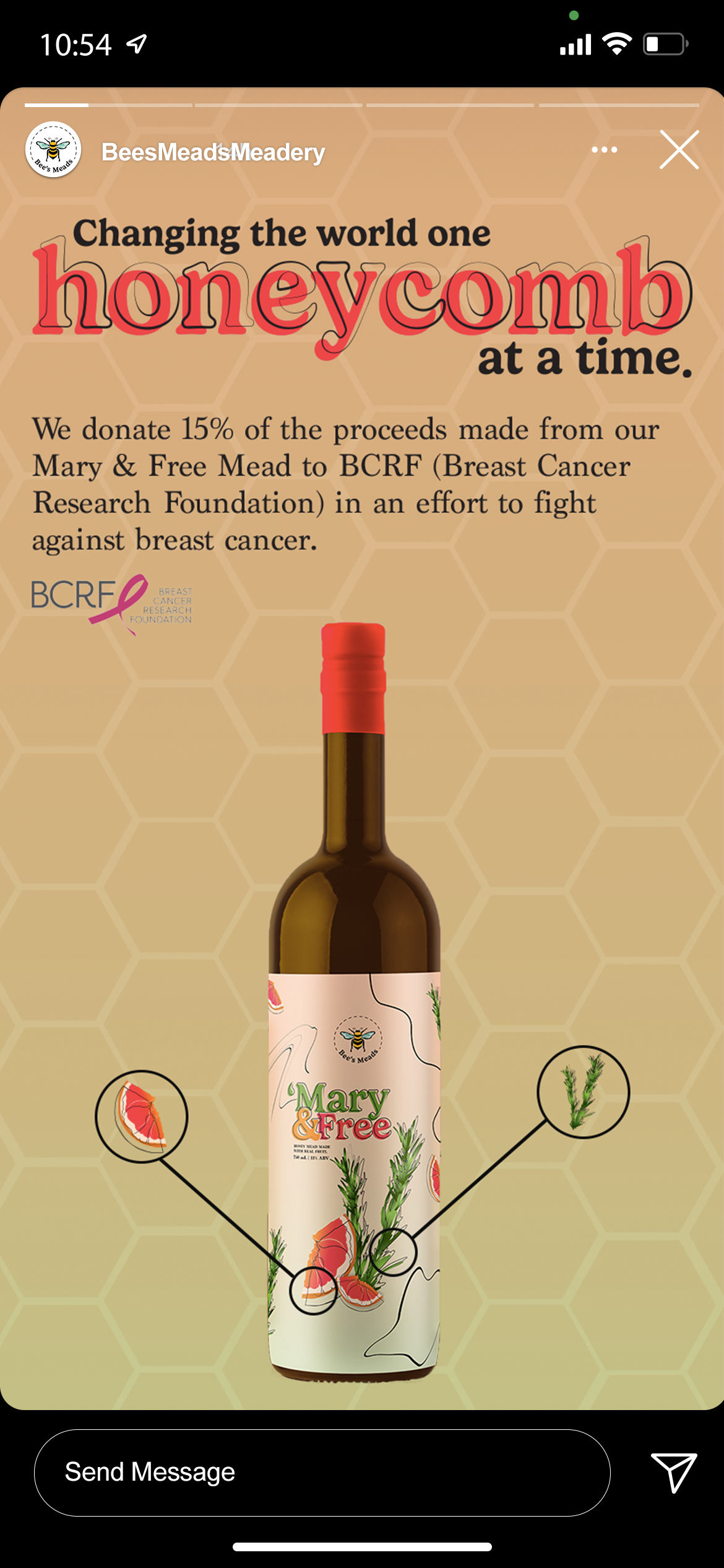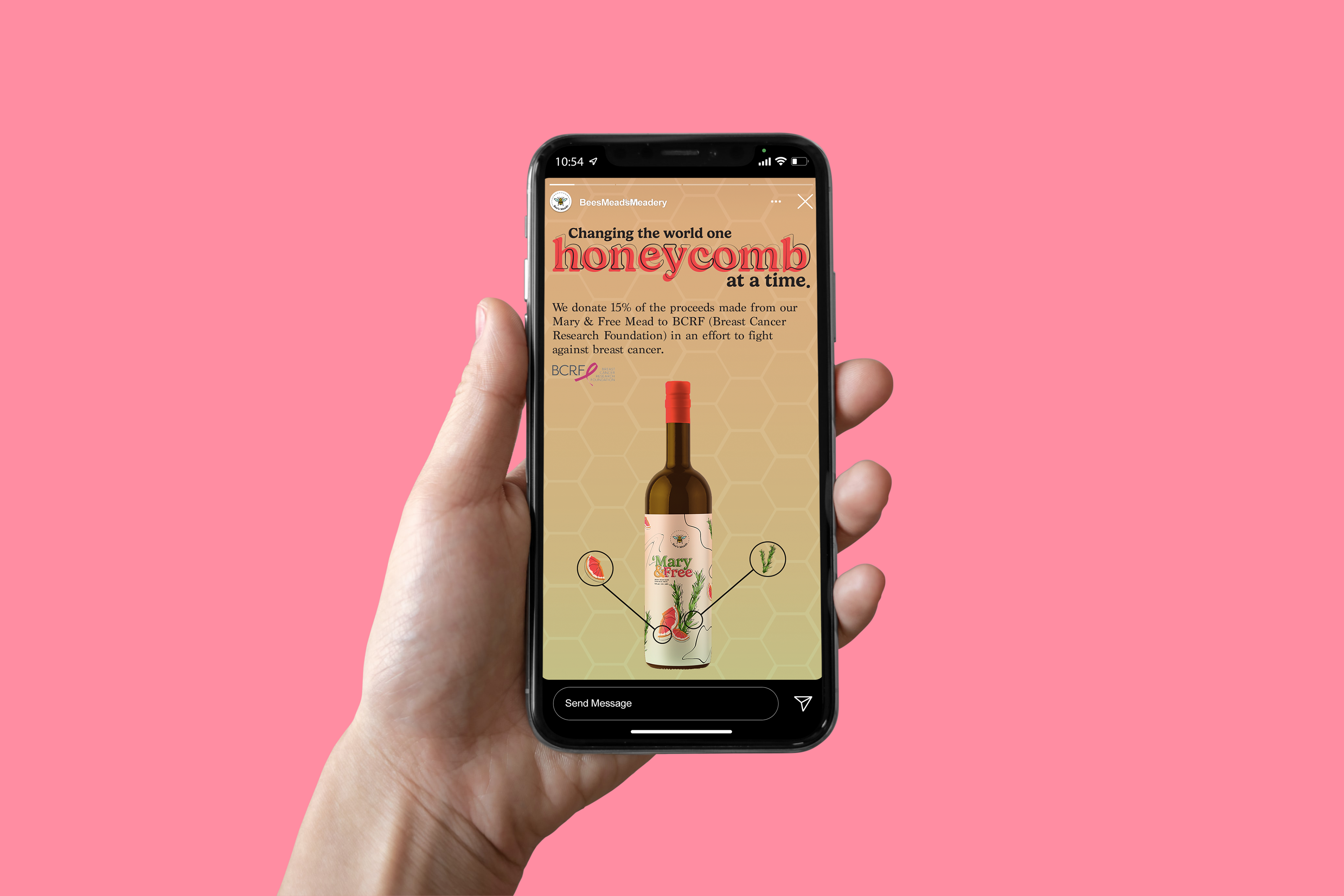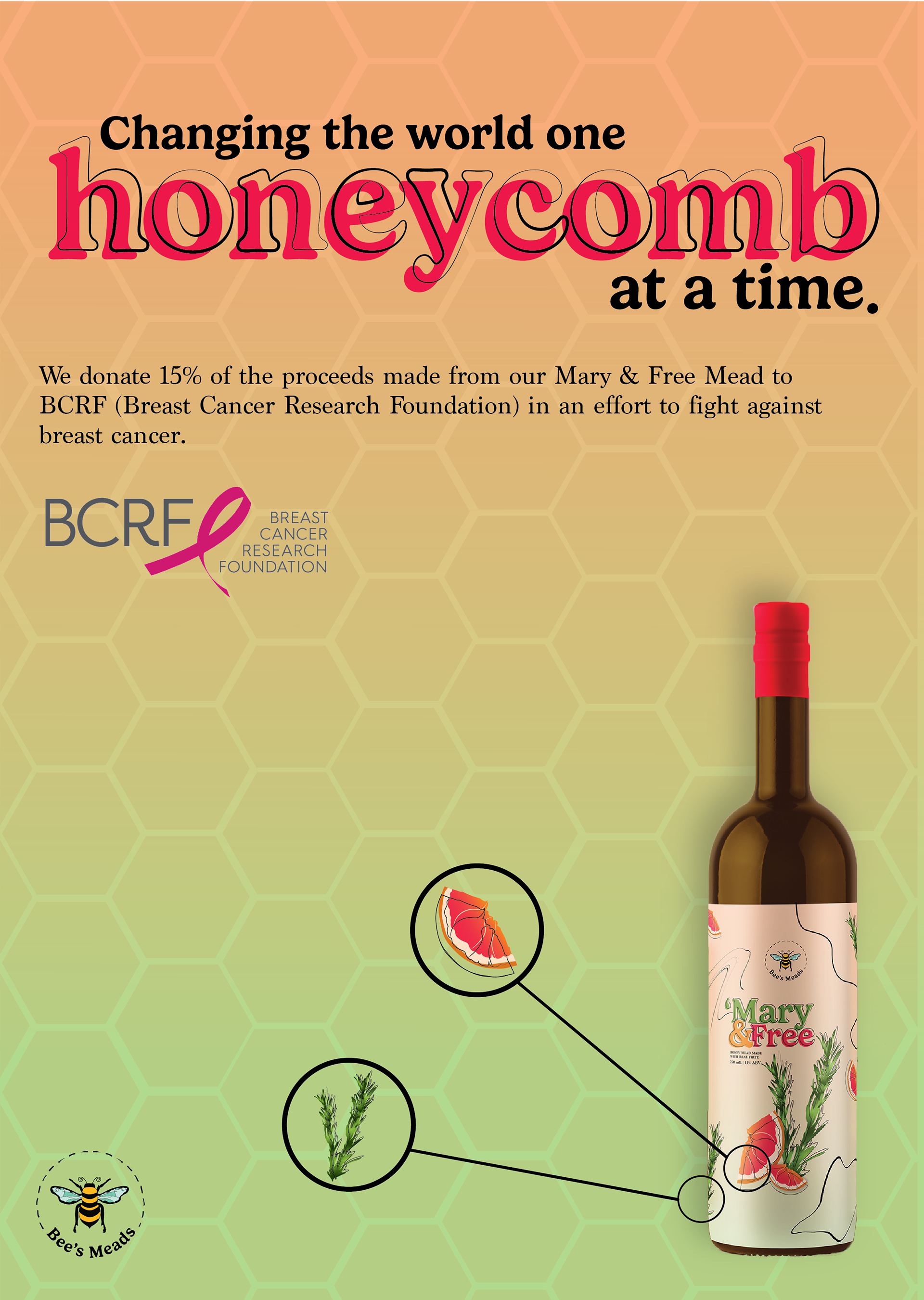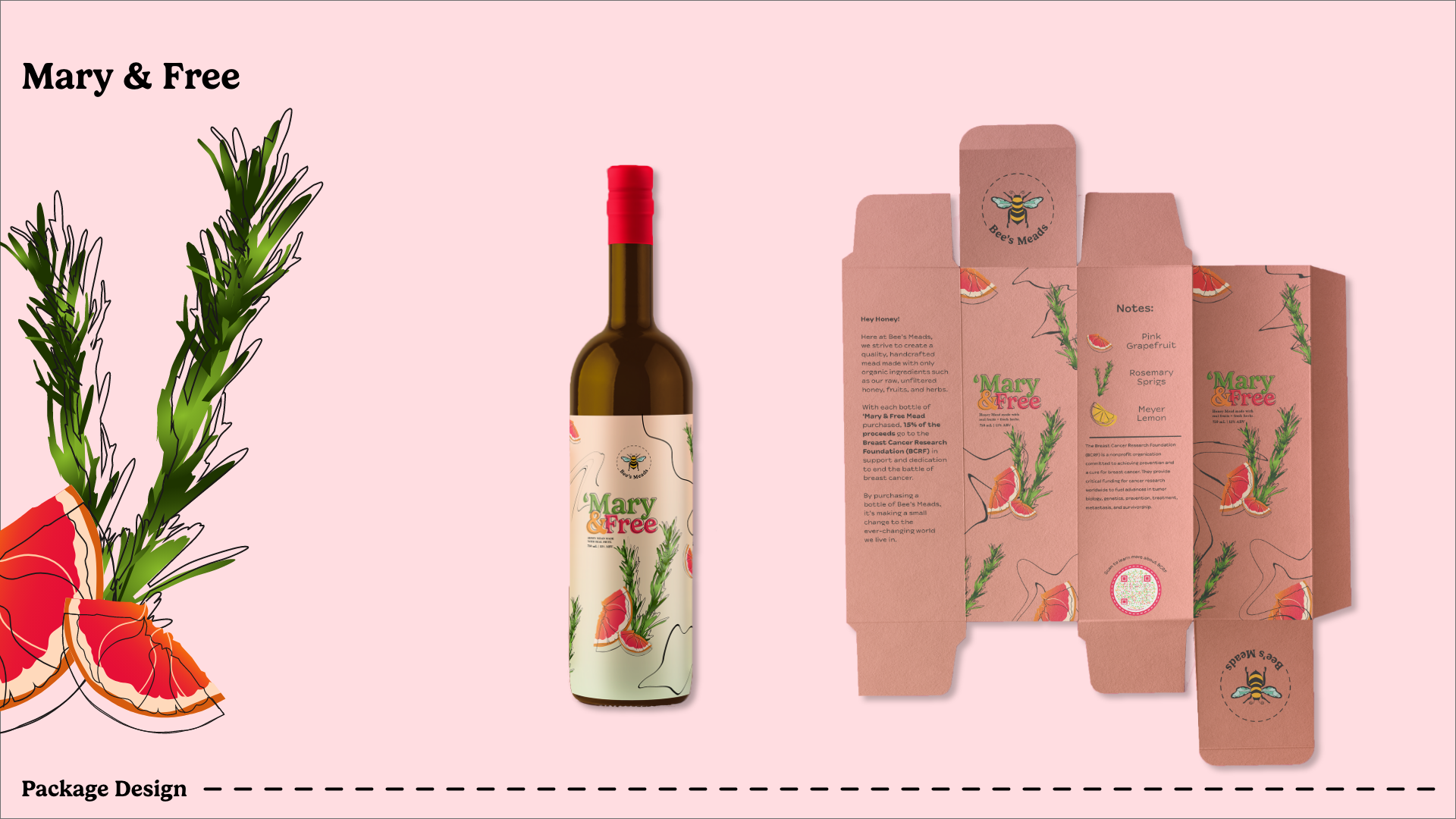 Mary & Free: Mead infused with pink grapefruit and rosemary (grapefruit and rosemary illustrations) -- 15% of the proceeds will go to BCRF (Breast Cancer Research Foundation) in October.