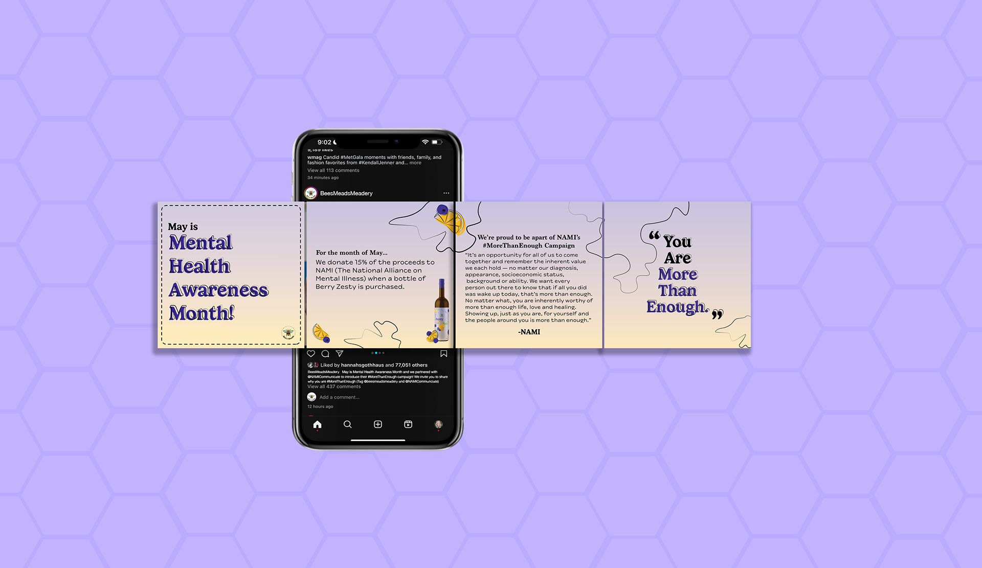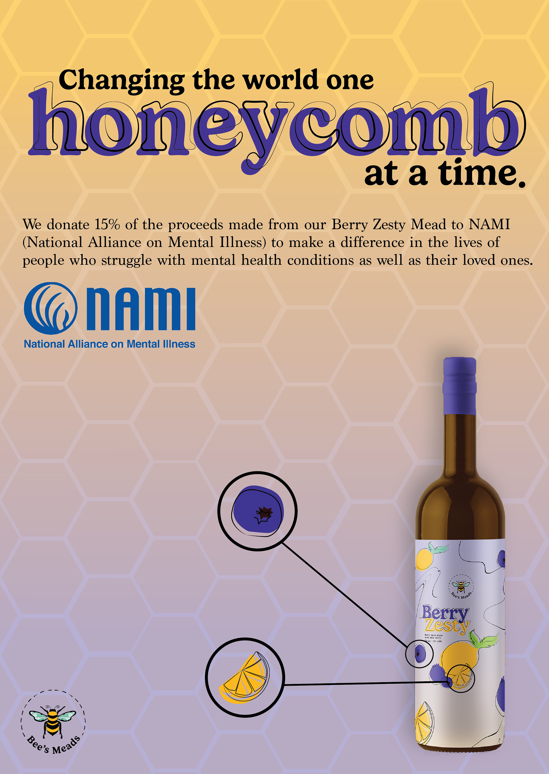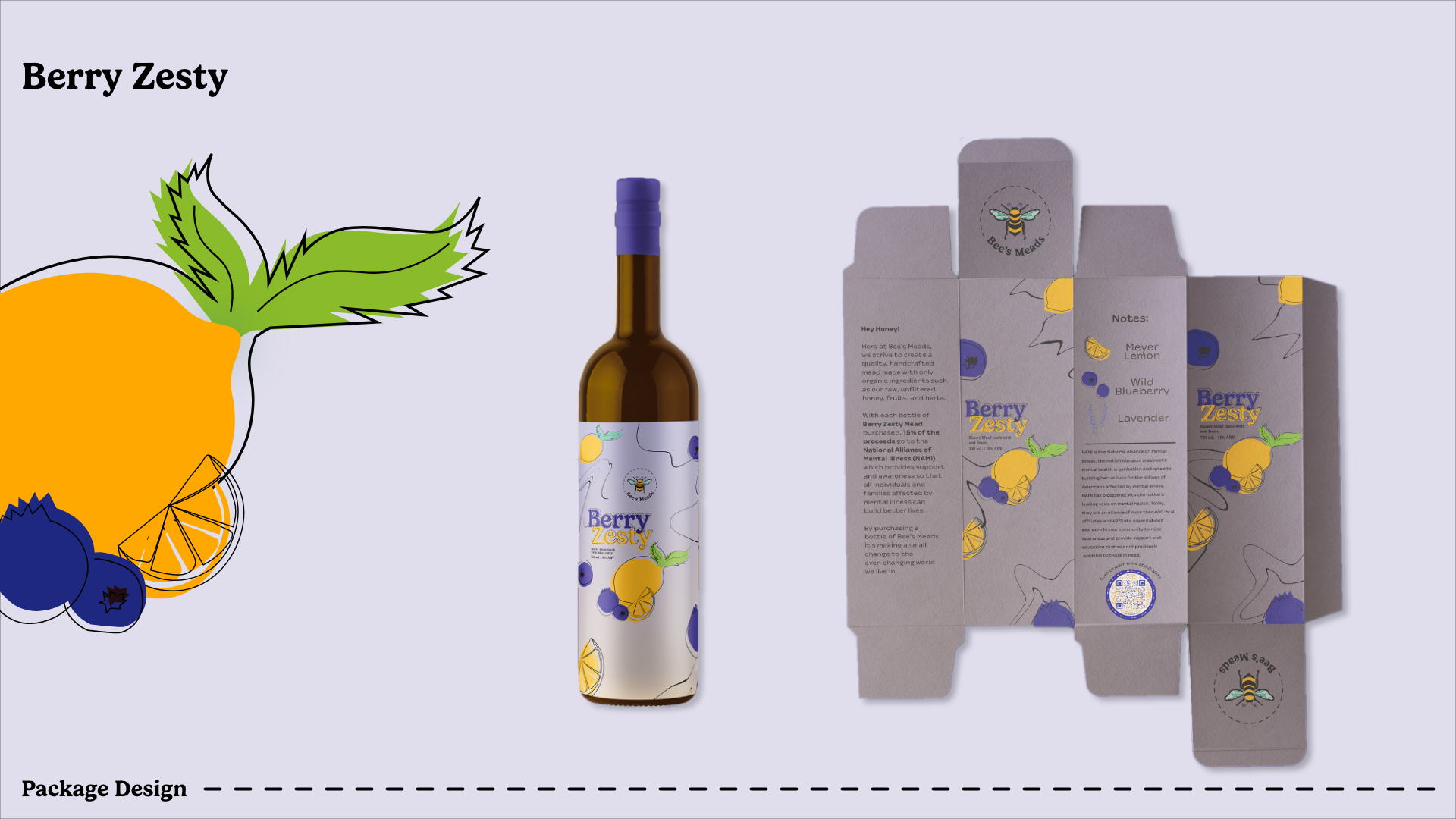 Berry Zesty: Mead infused with blueberry and lemon (blueberry and lemon illustrations) -- 15% of the proceeds will go to NAMI (National Alliance on Mental Illness) in May.