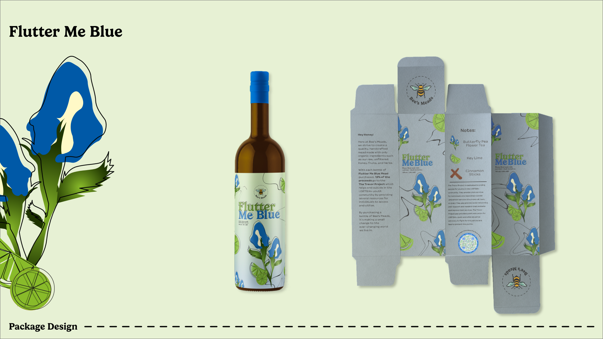 Flutter Me Blue: Mead infused with butterfly pea flower tea and key lime (butterfly pea flower plant and lime illustrations) -- 15% of the proceeds will go to The Trevor Project in June.